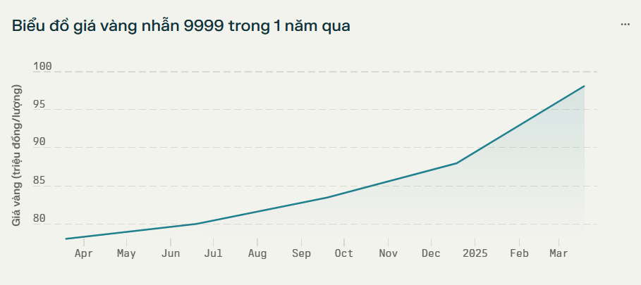 Dựa trên dữ liệu từ tháng 3/2024 đến tháng 3/2025, giá vàng nhẫn 9999 tại Việt Nam đã tăng mạnh: