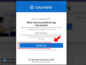 - Một cửa sổ pop-up sẽ hiện ra với các tùy chọn đăng ký khác nhau (ví dụ: mua khóa học, dùng thử miễn phí, đăng ký Specialization).