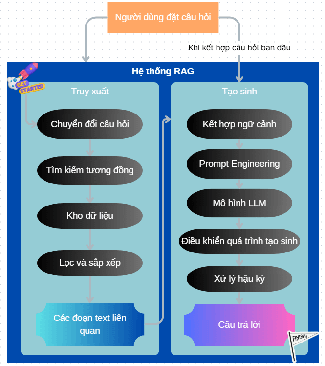 • Câu trả lời: Đây là đầu ra cuối cùng của hệ thống RAG, cung cấp câu trả lời cho câu hỏi ban đầu của người dùng dựa trên cả kiến thức của LLM và thông tin được truy xuất từ kho dữ liệu.